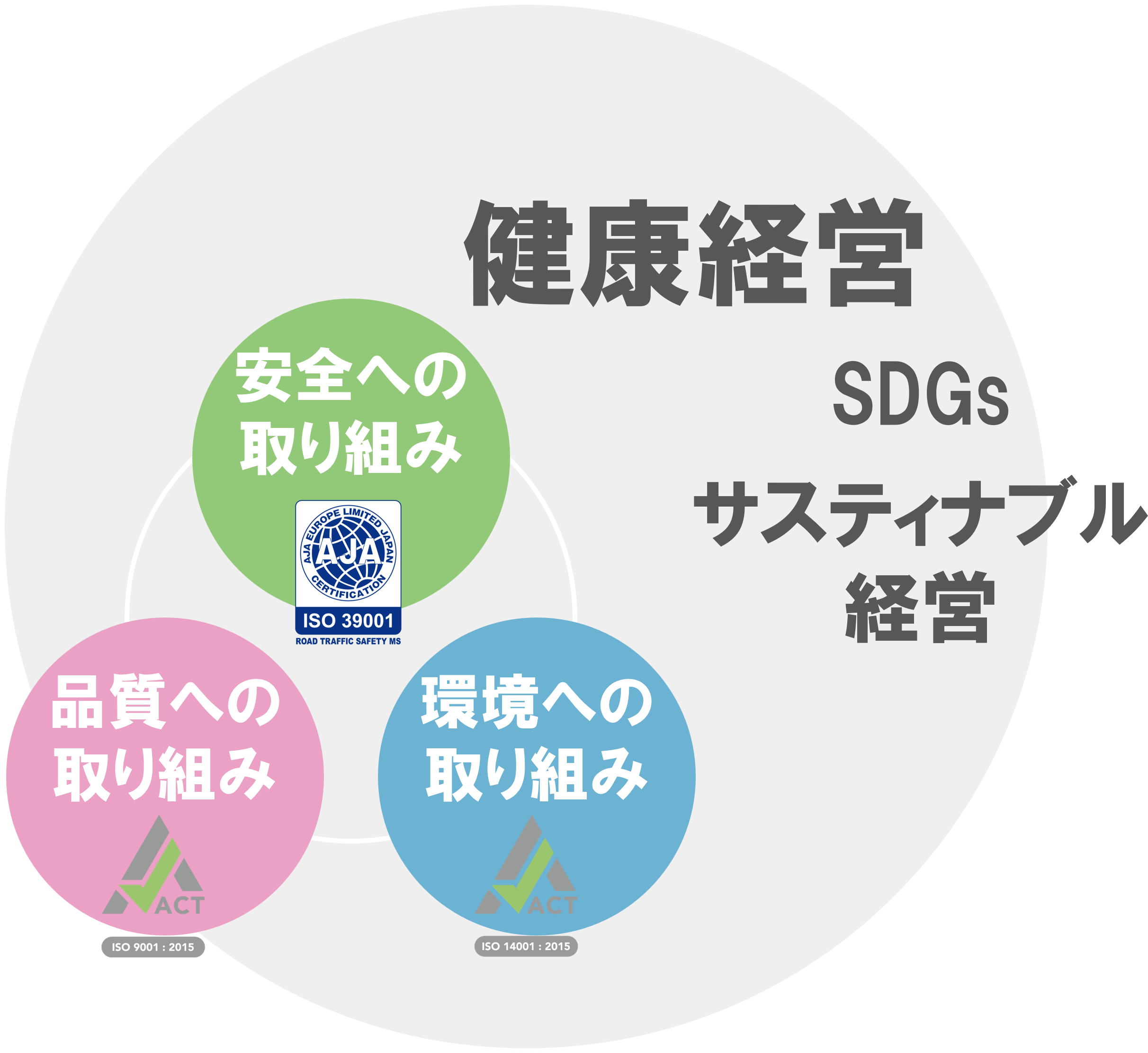 私たちは、様々な視点から、様々な取り組みが複合的に行えるように、ISO(9001,14001,39001)を統合したマネジメントシステムを運用しています。
